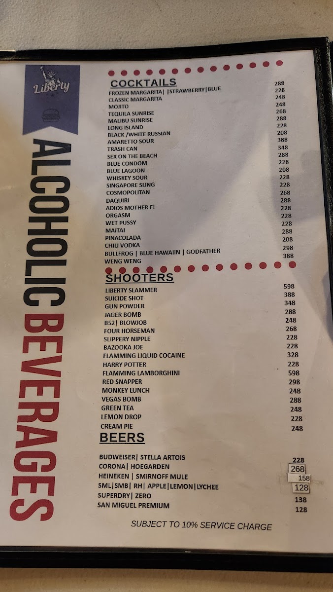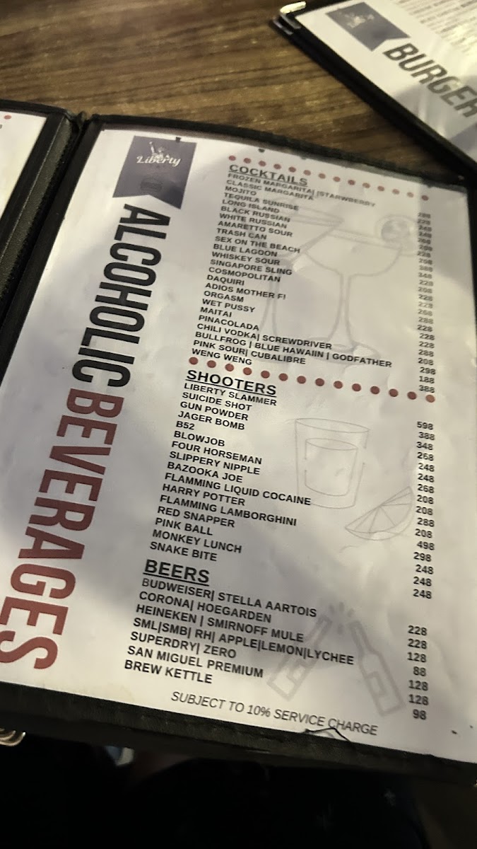 On the drinks side, Liberty offers a thoughtful range of cocktails and beverages that match the setting's casual, yet inviting vibe. From classic Frozen Margaritas and colorful Tequila Sunrises to a refreshing モヒート, each drink fits effortlessly into the easygoing pace of the bar’s atmosphere, enhancing the overall experience without overwhelming it.